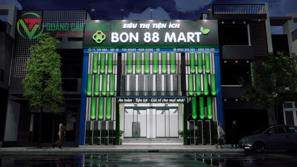 Biển hiệu siêu thị bon 88 mart Xem thêm: Các mẫu biển hiệu nhà hàng, quán ăn đẹp Tương Lai Đơn vị chuyên thiết kế thi công quảng cáo chuyên nghiệp giá rẻ